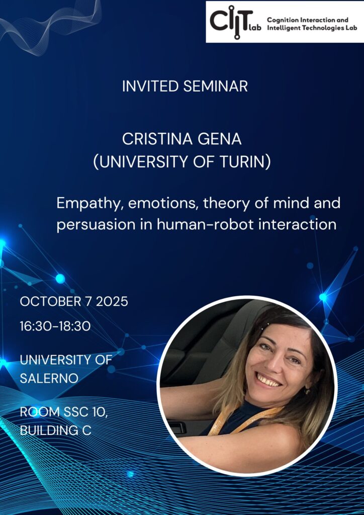 On October 7 2025 Prof. Cristina Gena from the Department of Computer Science of the University of Turin, will deliver an invited seminar on the topic “Empathy, emotions, theory of mind, persuasion in human-robot interaction“.